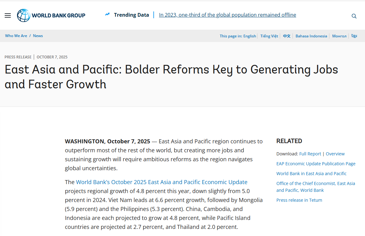 圖源:世界銀行。 世行今年4月曾預測,中國今明兩年的經濟增長率均為4.0%。不過,中國經濟上半年錄得5.3%的超預期增長。據國務院新聞辦7月15日發佈的中國上半年國民經濟運行情況數據,中國上半年GDP同比增長5.3%,比去年同期和去年全年均提升0.3個百分點,從四大宏觀指標看,經濟增長穩中略升,表明經濟運行“穩”的主基調沒有變。初步核算,上半年GDP為660536億元,同比增長5.3%,比去年同期和去年全年均提升0.3個百分點。 東亞經濟表現繼續好於世界其他大部分地區 世界銀行2025年10月期預測,今年東亞與太平洋地區經濟增速為4.8%,略低於2024年的5.0%。越南以6.6%的增速領先,其次是蒙古(5.9%)和菲律賓(5.3%);中國、柬埔寨和印度尼西亞均預計增長4.8%,太平洋島國為2.7%,泰國為2.0%。 報告寫道:“該地區的經濟表現繼續好於世界其他大部分地區,但面對當前的全球不確定性,該地區需要推進雄心勃勃的改革,才能創造更多就業機會,保持經濟增長。” 報告認為,東亞包容性發展的成功模式目前面臨新的挑戰。近期的就業增長主要集中在低生產率、通常是非正規的服務業崗位,這些崗位提供的發展機會有限。此外,年輕人就業困難,女性勞動力參與率仍然較低。儘管2025至2026年預計將有2500萬人擺脫貧困,但在該地區大多數國家,易陷入貧困的人口比例已超過中產階級。 更大膽的改革是創造就業和加快增長的關鍵 世界銀行東亞與太平洋地區副行長卡洛斯·費利佩·哈拉米略表示:“該地區面臨一個就業悖論——經濟增長相對強勁,但未能創造足够的高質量就業崗位。通過更大膽的改革來消除企業市場准入和競爭障礙,可以釋放私人資本,使有活力、高效率的企業得以蓬勃發展,創造新的就業機會。在該地區努力實現包容性增長、滿足人民發展願望的過程中,世界銀行將始終是其堅定的合作夥伴。” 高頻經濟活動指標顯示地區經濟增長勢頭正在放緩。儘管零售額有所增長,但消費者信心尚未恢復到新冠疫情前的水平;工業生產強勁,但企業信心低迷;近期關稅上調前出口有所加速,但新出口訂單表現疲軟。 預計2026年地區經濟增速將放緩至4.3%。未來增長表現將受諸多因素影響,包括貿易限制增加,全球不確定性雖有緩解但仍居高位,全球增長放緩,以及各國國內政策選擇——尤其是一些國家對財政刺激而非結構性改革的依賴。 報告呼籲推進人力資本和數字基礎設施領域的改革和投資,加強服務業競爭,實行有助於確保就業機會與勞動者技能相匹配的政策。人工智能、機器人技術和數字平台的快速發展,要求企業、勞動者和政策制定者掌握新技能,提高應對變化的敏捷性和適應力。 世界銀行東亞與太平洋地區首席經濟學家阿迪蒂亞·馬圖表示:“過去30年,東亞地區出口導向的勞動密集型增長使10億人擺脫貧困,但該地區目前面臨貿易保護和工作崗位自動化的雙重挑戰。營商環境改革和教育水平提升可以促進機會與能力之間的良性循環,從而實現更高的增長和更好的就業。” (完) 【編輯:錢林霞】