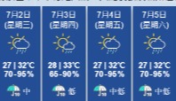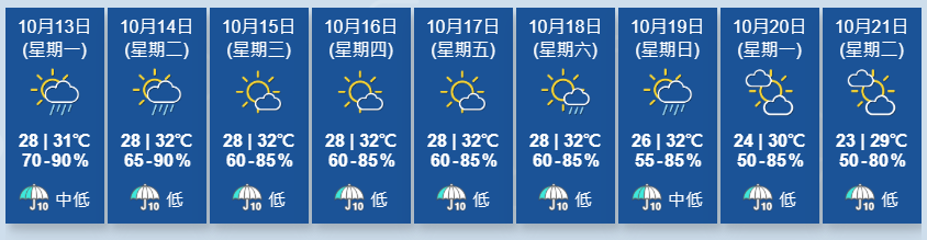 香港未來一周天氣情況。(圖源:香港天文台) 展望未來一兩日,廣闊低壓槽會繼續帶來驟雨。隨著低壓槽遠離及受高空反氣旋影響,本週中至後期天色大致良好,天氣炎熱。預料一股東北季候風會在下週初影響華南,該區氣溫稍為下降。而一個低壓區會在本週後期在菲律賓以東海域逐漸發展,並在週末期間移向呂宋一帶。受東北季候風影響,其隨後路徑及發展存在變數。此外,熱帶氣旋娜基莉會在今明兩日橫過日本以南海域。 (完) 【編輯:錢林霞】