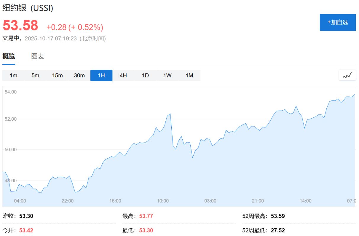 黃金價格走勢圖。網上交易所截圖 此外,當日COMEX白銀期貨收漲3.99%,報53.43美元/盎司,同樣刷新收盤新高。 截至發稿,COMEX白銀期貨再度上漲0.52%,報53.58/盎司。