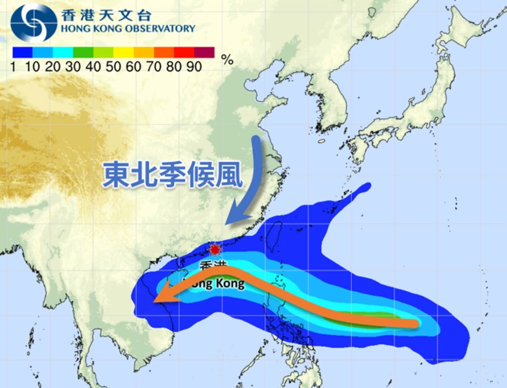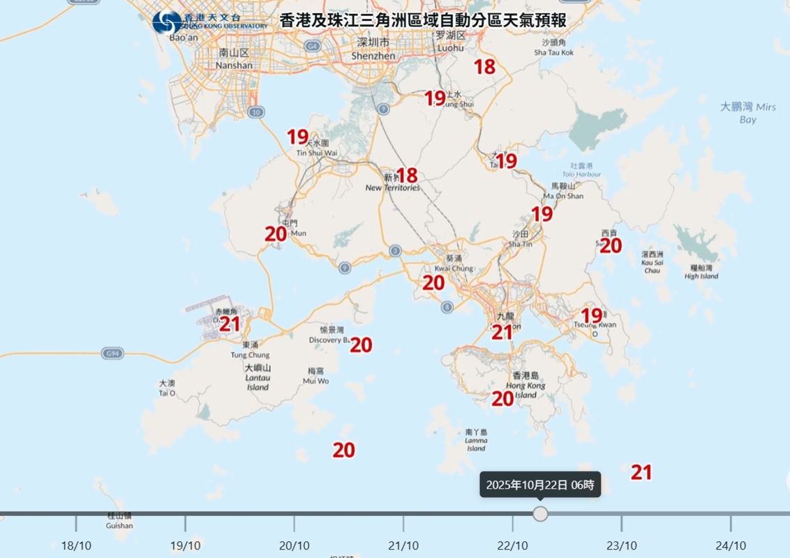 香港天文台預料下周三(22日)多區氣溫跌穿20℃,其中石崗及打鼓嶺更低見18℃。香港天文台網頁截圖 另外,香港天文台預測位於菲律賓以東海域之西北太平洋的對流雲團會在未來兩三日逐漸發展為熱帶氣旋,並在週末期間靠近呂宋一帶,隨後有較大機會進入南海東北部。此外,一股強烈東北季候風會在星期日(19日)抵達華南,在與潛在熱帶氣旋的共同影響下,本港下週初至中期風勢頗大,離岸及高地吹強風,氣溫顯著下降。