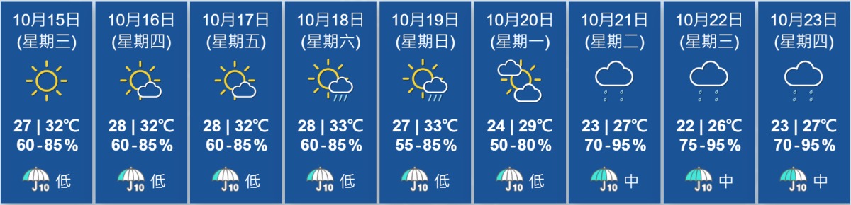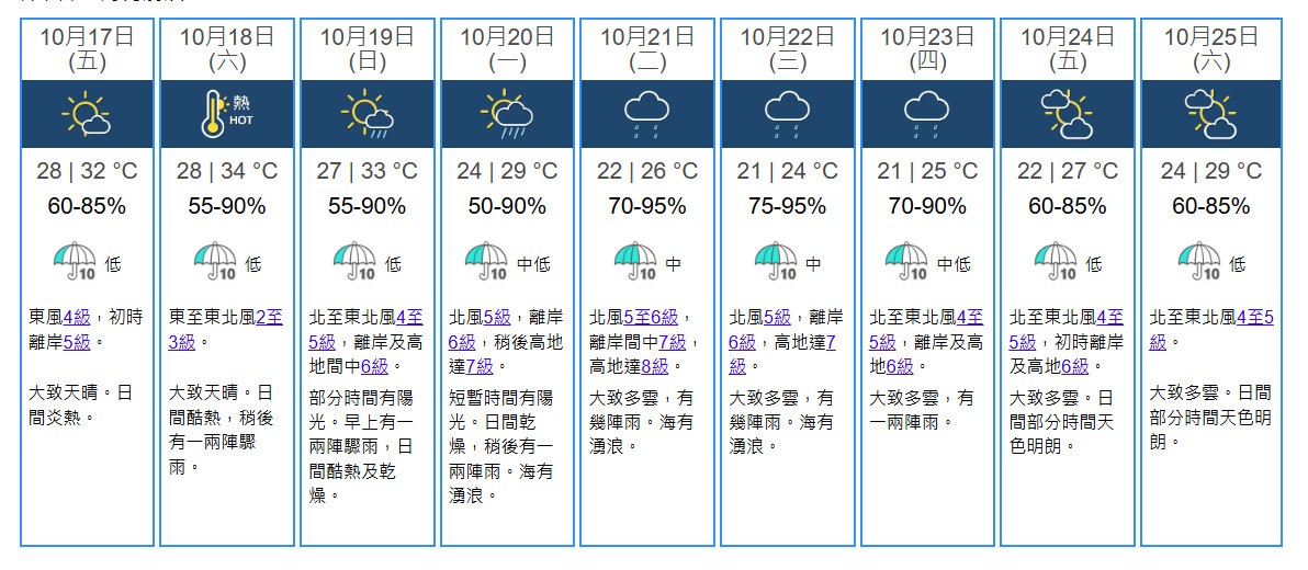 香港地區未來9天天氣預報。香港天文台網頁截圖 在天文大潮、東北季候風及潛在熱帶氣旋的共同影響下,天文台預計由下星期一(20日)起,連續數晚漲潮時本港沿岸水位會偏高,沿岸低窪地區的居民請預早採取適當防水浸措施。