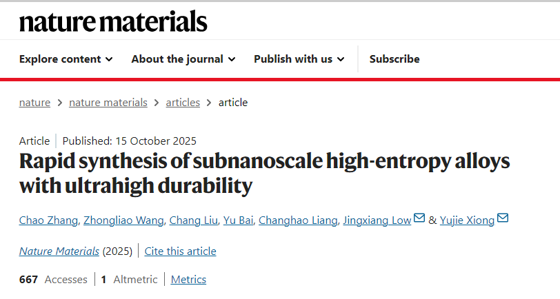 圖源:國際期刊《自然·材料》網頁截圖 科研團隊創新性地使用了激光輻照技術,在溫和條件下實現了多種金屬的均勻混合,並成功製備出亞納米級別的高熵合金顆粒。納秒脈衝激光可以在極短時間內將顆粒表面溫度迅速提升至2000攝氏度以上,再以每秒超過十億度的速度迅速冷卻。這一“快熱快冷”過程不僅克服了傳統合成方法的局限,還成功將合金顆粒尺寸控制在亞納米級別。 據了解,該項激光合成新方法極大拓展了高熵合金的材料體系與適用範圍,有望推動其在能源、催化等領域的實際應用,為新材料研發提供全新思路。(完) 【編輯:彭玉婷】