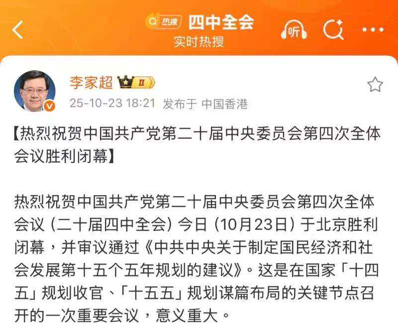香港中通社10月23日電 中國共產黨第二十屆中央委員會第四次全體會議23日於北京閉幕,審議并通過《中共中央關於制定國民經濟和社會發展第十五個五年規劃的建議》。香港特區行政長官李家超發文祝賀二十屆四中全會勝利閉幕,表示這是在國家“十四五”規劃收官、“十五五”規劃謀篇布局的關鍵節點召開的一次重要會議,意義重大。