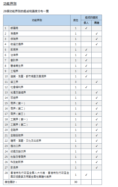 功能界別的構成和議席分佈為: