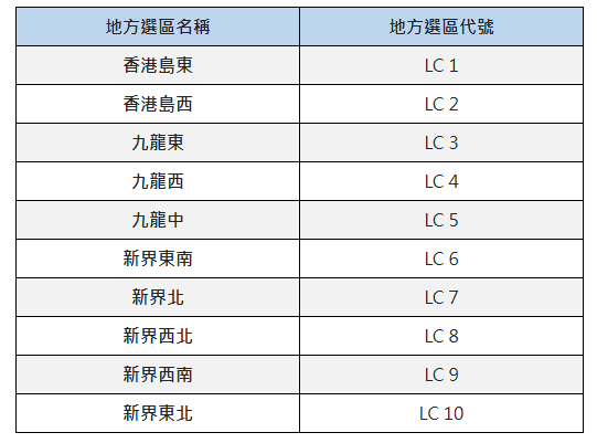 地方選區方面,共設10個地方選區,每個選區產生2名議員。10個地方選區如下: