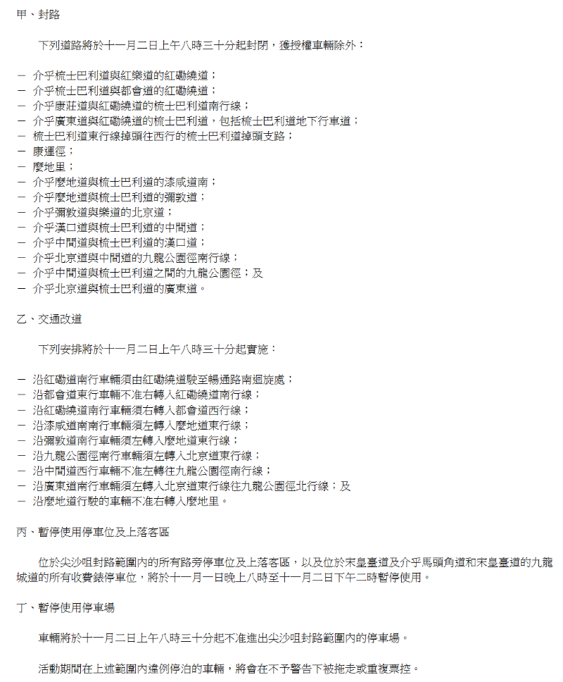 香港新聞網10月31日電 香港警方31日提醒市民,為配合第十五屆全國運動會火炬傳遞,將於11月1日至2日在港島及九龍分階段實施以下特別交通安排,所有受影響道路將在火炬傳遞後適時開放。