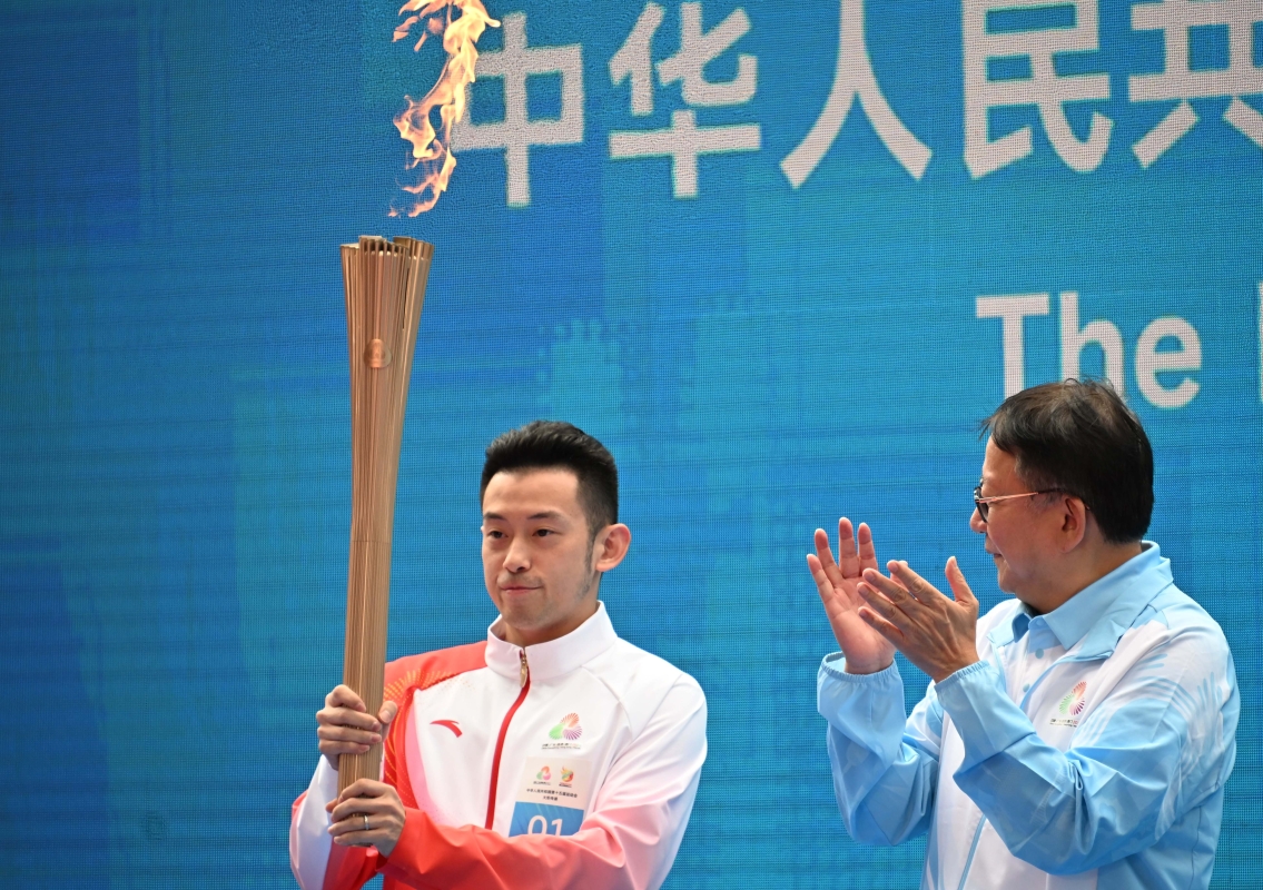 署理行政長官陳國基(右)將火炬交予第一棒的火炬手港隊男子乒乓代表黃鎮廷。
