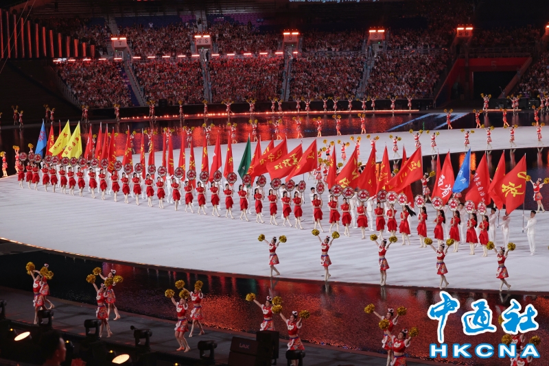 11月9日,中華人民共和國第十五屆運動會開幕式在廣東奧林匹克體育中心舉行。以“圓夢未來”為主題的開幕式包括“同根同源、同心同緣、同夢同圓”三個篇章,展現粵港澳大灣區的壯闊圖景。圖為體育代表團旗幟入場。(香港中通社記者 謝光磊 攝) 香港中通社圖片