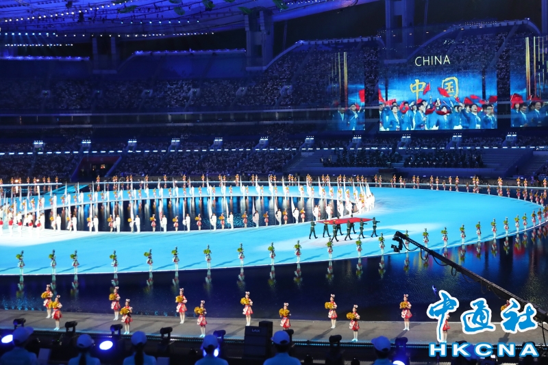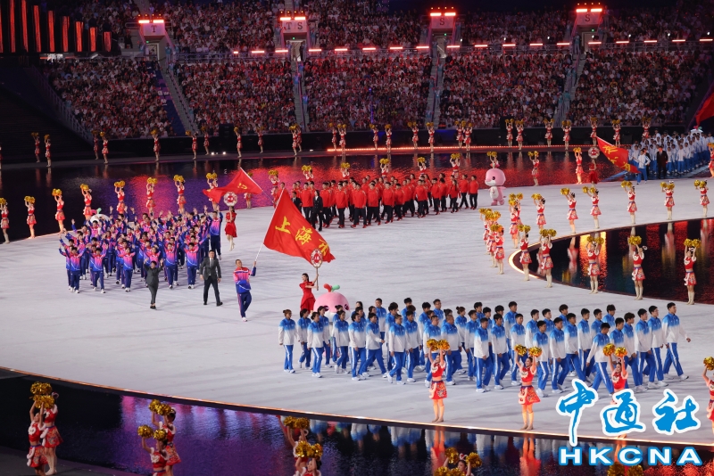 11月9日,中華人民共和國第十五屆運動會開幕式在廣東奧林匹克體育中心舉行。以“圓夢未來”為主題的開幕式包括“同根同源、同心同緣、同夢同圓”三個篇章,展現粵港澳大灣區的壯闊圖景。圖為運動員入場。(香港中通社記者 謝光磊 攝) 香港中通社圖片