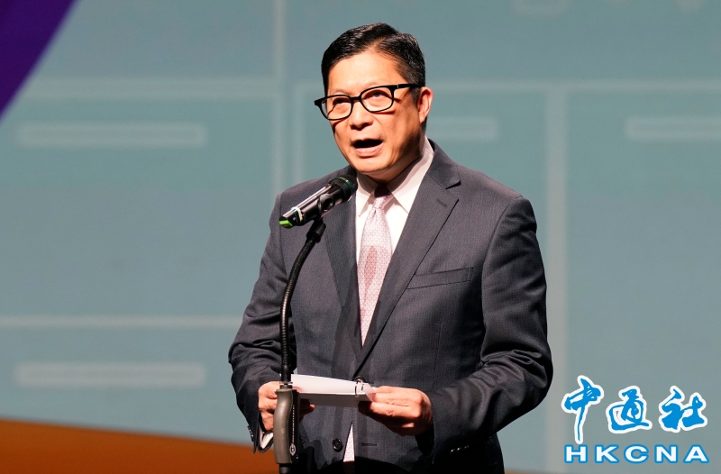 •   11月11日,由香港保安局主辦的國家安全校園互動劇場《校園食神大賽》啓動禮在香港大會堂舉行。保安局局長鄧炳強和教育局局長蔡若蓮博士出席主禮並致辭。互動劇場於啓動禮後進行首演。圖為為保安局局長鄧炳強致辭。(香港中通社 陳奕啟 攝) 香港中通社圖片