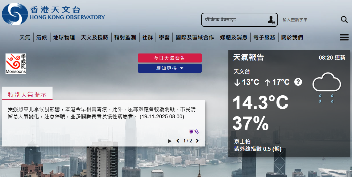 香港新聞網11月19日電 香港天文台表示,受強烈東北季候風影響,香港今早(19日)市區相當清涼。截至上午6時,錄得最低氣溫13.2度,是今年入秋以來的最低紀錄,而新界普遍再低一兩度。