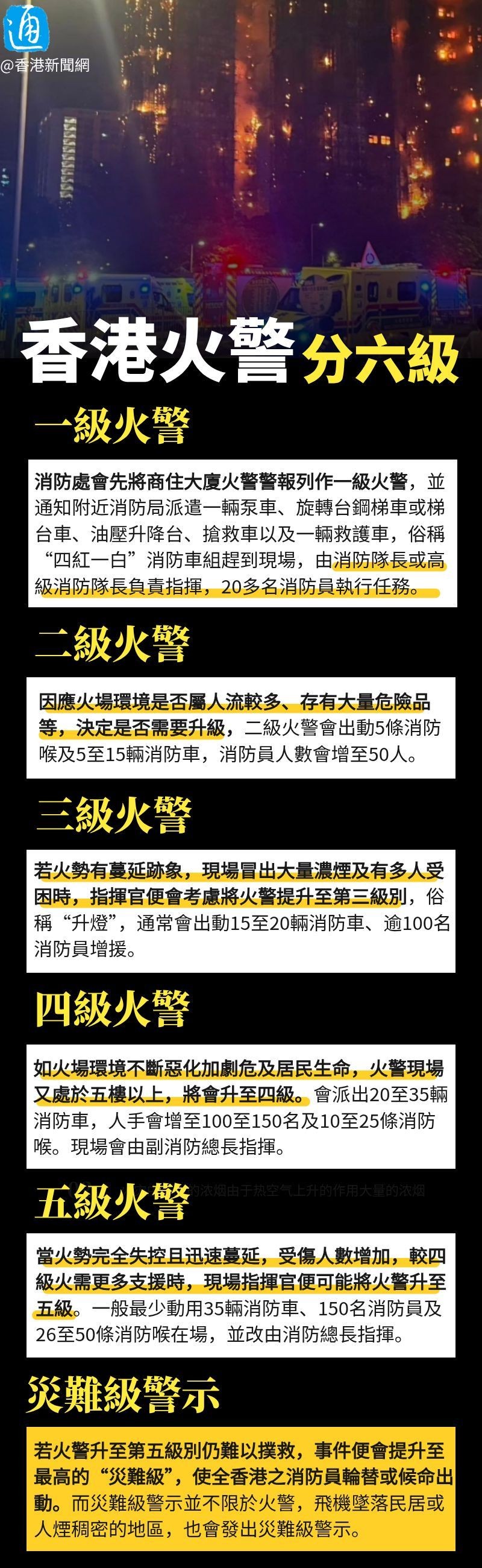 根據資料,香港的火警分級制度在1964年制定,按火災的不同情況分為一至五級,以及更高的“災難級”共六個級別,而每個級別都有相應的防火裝備。如何區分火警分級,一圖看清。