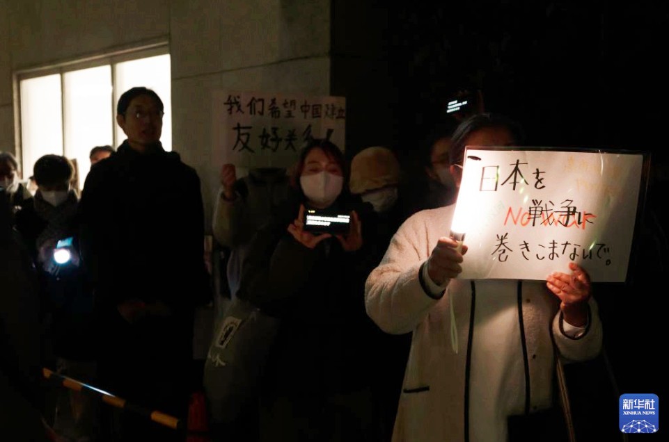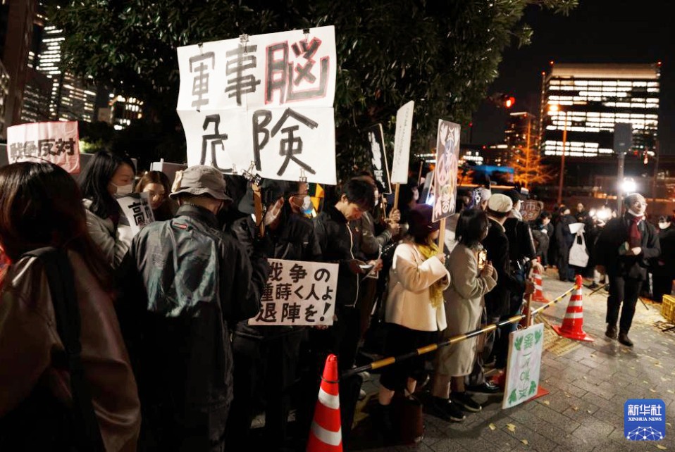 日本民眾星期五(11月28日)晚在位於東京的首相官邸前再度舉行抗議集會,要求高市早苗撤回相關言論。新華社記者 賈浩成 攝 據新華社28日報道,這是繼11月21日和25日的抗議活動後,在日本首相官邸前舉行的又一次抗議集會,有數百人參加。抗議者手持寫有“高市辭職”“不能忘記歷史,不能重蹈覆轍”等字樣的牌子,要求高市早苗撤回涉台言論。 抗議者友子對記者說:“目前中日關係降溫,不管怎麼看都是高市早苗的問題,也就是她的那番言論引起的。” 抗議者阪卷對記者說,中日關係正在不斷惡化,為防止事態繼續朝不好的方向發展,高市早苗應當撤回其錯誤言論。 抗議者遼在現場手舉一幅漫畫,畫面中高市早苗與一個“軍國主義幽靈”握手。他表示,很擔心日本走向軍國主義化。