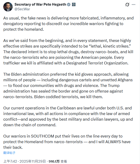 對於有關報道,五角大樓方面拒絕就此發表評論。而赫格塞思11月29日則在社交平台X上發帖,為美軍近期襲擊摧毀所謂“販毒船隻”的行動辯護,斥責《華盛頓郵報》的報道是“捏造的、煽動性的和貶損性的”,并堅稱:“我們目前在加勒比海地區的行動符合美國法律和國際法。”