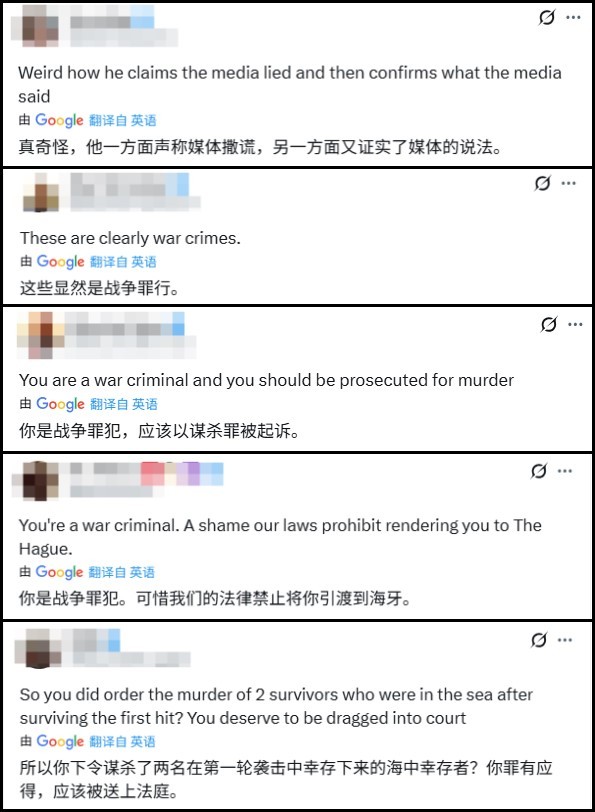 許多網友也在赫格塞思社交平台的評論區下提出質疑,認為赫格塞思的回應反而證實了媒體報道,抨擊赫格塞思為“戰爭罪犯”,希望他被送上法庭。