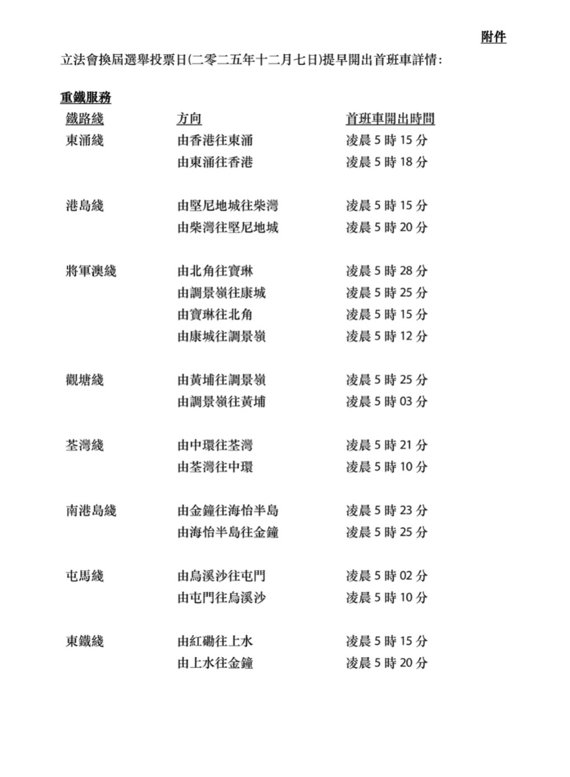 香港新聞網12月6日電 香港第八屆立法會選舉將於7日舉行。為配合選舉日,港鐵發布通告,指大部分綫路會於明日早上提早開出頭班車,以便票站人員前往票站作準備,並呼籲大家齊投票。    (完)