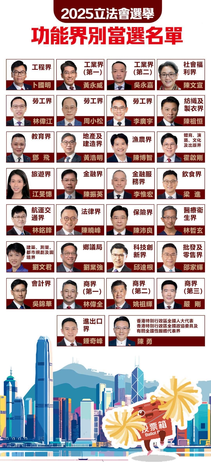 製圖:香港新聞網 蘇淳淳 地區直選20人當選名單: 香港島東:吳秋北、植潔鈴 香港島西:陳學鋒、陳家珮 九龍東:鄧家彪、張培剛 九龍西:梁文廣、鄭泳舜 九龍中:李慧琼、楊永杰 新界東南:方國珊、葉傲冬 新界北:譚鎮國、姚銘 新界西北:周浩鼎、莊豪鋒 新界西南:陳穎欣、郭芙蓉 新界東北:陳克勤、李梓敬 功能界別30人當選名單: 鄉議局:劉業強 漁農界:陳博智 保險界:陳沛良 航運交通界:林銘鋒 教育界:鄧飛 法律界:陳曉峰 會計界:吳錦華 醫療衞生界:林哲玄 工程界:卜國明 建築、測量、都市規劃及園境界:劉文君 勞工界:周小松、李廣宇、林偉江 社會福利界:陳文宜 地產及建造界:黃浩明 旅遊界:江旻憓 商界(第一):林偉全 商界(第二):姚祖輝 商界(第三):嚴剛 工業界(第一):黃永威 工業界(第二):吳永嘉 金融界:陳振英 金融服務界:李惟宏 體育、演藝、文化及出版界:霍啟剛 進出口界:鍾奇峰 紡織及製衣界:陳祖恒 批發及零售界:邵家輝 科技創新界:邱達根 飲食界:梁進 人大政協界:陳勇 選委會界別40人當選名單: 姚柏良、李家駒、文頴怡、吳傑莊、伍煥杰、劉智鵬、鄧銘心、樓家強、范凱傑、蘇紹聰、洪錦鉉、何俊賢、管浩鳴、吳英鵬、黃錦輝、陳永光、李鎮強、何君堯、林筱魯、陳恒鑌、何敬康、魏明德、范駿華、陳宗彝、陳凱欣、梁子穎、葛珮帆、朱立威、陳紹雄、林琳、莊家彬、李浩然、林振昇、黃國、黃錦良、簡慧敏、梁美芬、陳曼琪、陳祖光、陳仲尼 【編輯:紀東】