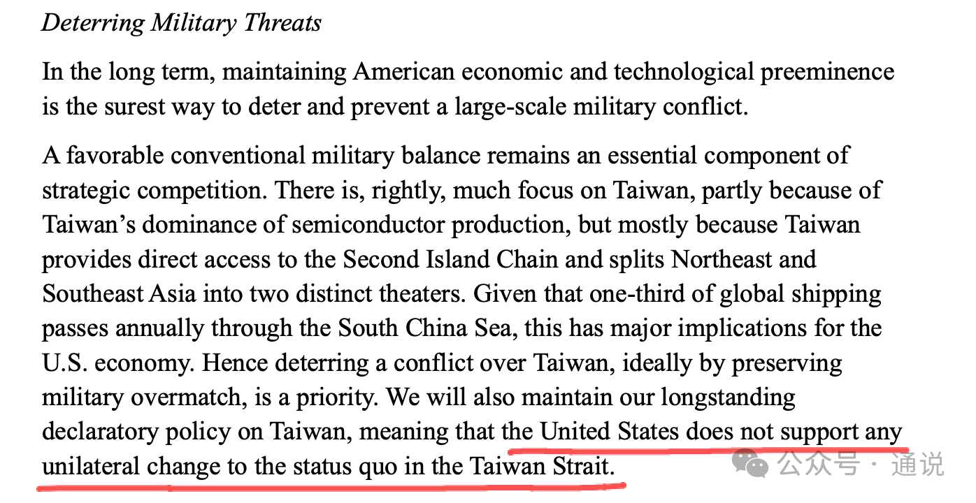 通說:事關台海美國變調,台當局假裝沒看懂美國政府近日發布最新國家安全戰略報告。在其涉台措辭中,雖然仍強調“嚇阻台海衝突”,但在用詞上出現明顯降級:將長期堅持的“反對”改變台海現狀,改為“不支持台海現狀遭任何單方面改變”。