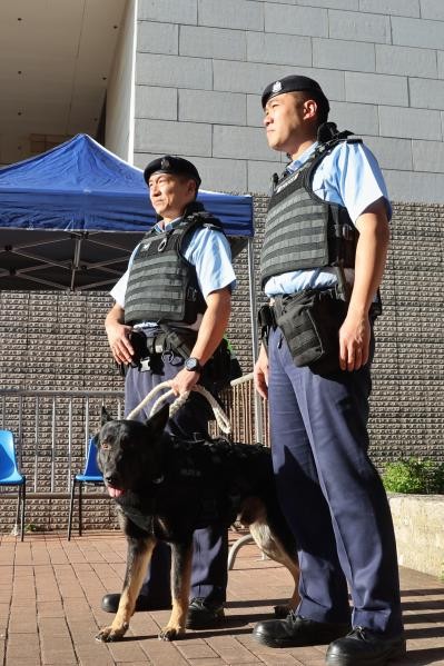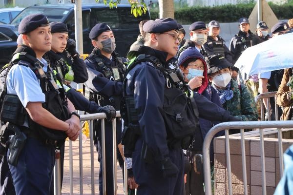 12月15日,壹傳媒創辦人黎智英與《蘋果日報》3間相關公司涉嫌串謀勾結外國勢力案今早宣佈判決,西九龍裁判法院外保安措施顯著加強,多名穿著防刺戰術背心的警員在場巡邏,警方亦設置路障,所有進入法庭的車輛,均需接受安檢。(記者 謝光磊 攝) 大批公眾人士按秩序準備入場旁聽。現場亦有便利分割隊流的通道安排,數十名警員荷槍實彈,維護秩序,法院門口附近亦有警察牽引警犬排查。法院門口的道路車輛限流,轉為單行道,數輛警車沿著街道一側停於附近,對整條街道進行佈防。(完) 【編輯:錢林霞】