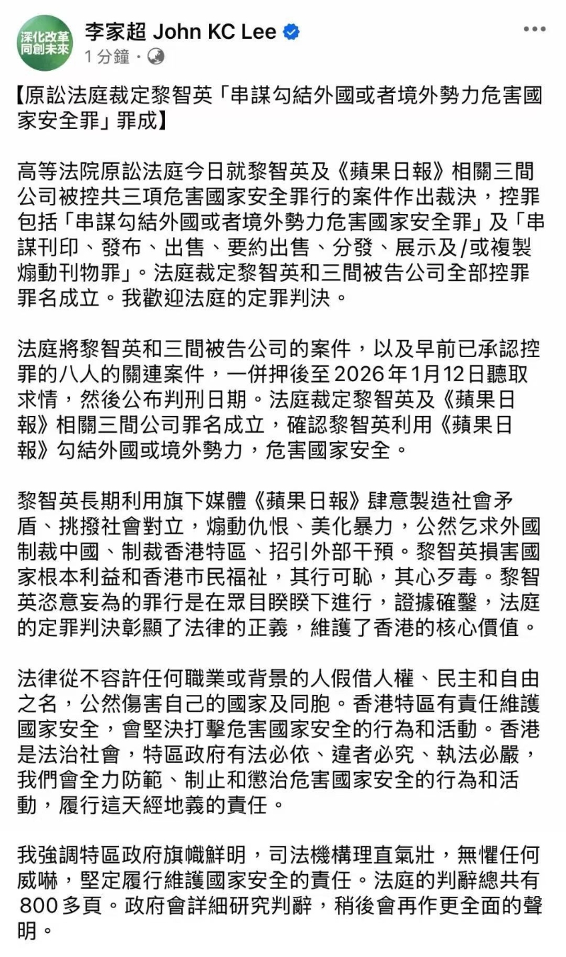 香港新聞網12月15日電 12月5日,香港特首李家超在社交媒體發表帖文稱,歡迎香港高等法院今日就黎智英案件的定罪判決。帖文全文如下: 高等法院原訟法庭今日就黎智英及《蘋果日報》相關三間公司被控共三項危害國家安全罪行的案件作出裁決,控罪包括“串謀勾結外國或者境外勢力危害國家安全罪”及“串謀刊印、發布、出售、要約出售、分發、展示及/或複製煽動刊物罪”。法庭裁定黎智英和三間被告公司全部控罪罪名成立。我歡迎法庭的定罪判決。 法庭將黎智英和三間被告公司的案件,以及早前已承認控罪的八人的關連案件,一併押後至2026年1月12日聽取求情,然後公布判刑日期。法庭裁定黎智英及《蘋果日報》相關三間公司罪名成立,確認黎智英利用《蘋果日報》勾結外國或境外勢力,危害國家安全。 黎智英長期利用旗下媒體《蘋果日報》肆意製造社會矛盾、挑撥社會對立,煽動仇恨、美化暴力,公然乞求外國制裁中國、制裁香港特區、招引外部干預。黎智英損害國家根本利益和香港市民福祉,其行可恥,其心歹毒。黎智英恣意妄為的罪行是在眾目睽睽下進行,證據確鑿,法庭的定罪判決彰顯了法律的正義,維護了香港的核心價值。 法律從不容許任何職業或背景的人假借人權、民主和自由之名,公然傷害自己的國家及同胞。香港特區有責任維護國家安全,會堅決打擊危害國家安全的行為和活動。香港是法治社會,特區政府有法必依、違者必究、執法必嚴,我們會全力防範、制止和懲治危害國家安全的行為和活動,履行這天經地義的責任。 我強調特區政府旗幟鮮明,司法機構理直氣壯,無懼任何威嚇,堅定履行維護國家安全的責任。法庭的判辭總共有800多頁。政府會詳細研究判辭,稍後會再作更全面的聲明。