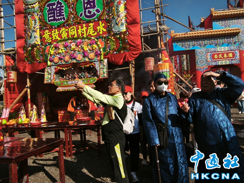12月16日,香港元朗錦田鄉水頭村周王二公書院前的傳統活動“錦田鄉酬恩建醮”醮場。據悉,錦田傳統活動“錦田鄉酬恩建醮”是香港歷史最悠久的太平清醮之一。據說300多年前,清朝兩廣總督周有德和王來任協助沿海居民復界,讓人民返鄉生活。為報答恩德,錦田鄉民在1684年興建周王二公書院教育子弟,並每10年舉行一次酬恩祭典,以答謝先賢、超渡遷界喪生的亡魂及祈福保佑境內居民。2025年錦田鄉酬恩建醮踏入第34屆在12月13日至19日舉行一系列傳統儀式和活動,如大士巡游、祈福儀式、粵劇大戲、龍獅表演、鄉鄰齋宴等等。 (香港中通社記者洪少葵攝) 香港中通社圖片