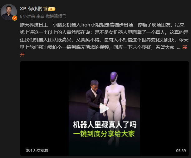 圖源:何小鵬微博截圖 對此,小鵬汽車董事長何小鵬親自回應,發布無剪輯視頻,現場拉開IRON背部拉鏈,曝光內部晶格肌肉、控制器、肩膀運輸固定器、耳朵處的麥克風陣列及手部諧波關節等關鍵部件,徹底打消外界疑慮。他更宣佈,IRON量產版目標在2026年底前實現高階量產,並開放軟件開發套件(SDK),邀請全球開發者共建生態。 全球競賽:中國供應鏈成關鍵變量 國際投行高盛在2025年11月發布的《中國機器人供應鏈》報告指出,多數中國供應商正為2026年下半年的人形機器人大規模量產做好准備,整體產能規劃高達每年10萬至100萬台。這意味著,中國不僅在整機集成上領先,更在核心零部件、算法、電池、感測器等環節形成完整生態。 在這場全球人形機器人競賽中,技術實力固然重要,但能否實現穩定、低成本、大規模的量產,才是決定商業化成敗的關鍵。而中國正憑藉其獨一無二的製造體系與市場韌性,搶占這一戰略高地。 從被質疑“特效造假”到以實機交付回應,從單一企業突圍到產業集群崛起,中國人形機器人正經歷從“能不能做”到“能不能量產”再到“能不能用好”的三重跨越。面對外部質疑,中國企業選擇的不是辯解,而是用行動說話——用一台台真實交付的機器人,鋪就通往未來的道路。 正如譚旻所言:“他們懷疑,是因為他們還做不到。”而歷史,往往屬於那些率先把夢想變成產線的人。(完) 【編輯:黎金良】