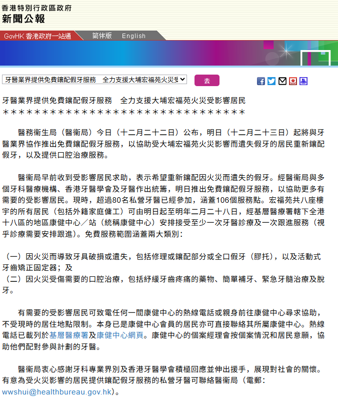 圖片來源:香港政府新聞處截圖 醫衞局早前亦推出家庭醫生義診計劃和中醫義診服務,又於23日推出牙醫免費鑲配假牙服務,支援受影響居民的基層醫療服務需要。 數據顯示,截至23日,超過300名私營家庭醫生參加義診計劃,累計57名居民獲安排義診服務;中醫義診服務有超過360名中醫師參加,累計16名居民獲安排義診服務。牙醫免費鑲配假牙服務有超過80名私營牙醫參加。 基層醫療署統籌全港18區康健中心設立熱線,為受影響居民安排個人化個案管理服務,包括配對私營醫療界別家庭醫生及中醫師義診、協調醫管局覆診安排等。截至23日,熱線累計接獲超過176人次來電。(完) 【編輯:林曉惠】