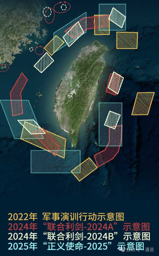 相比解放軍以往進行的“聯合利劍”“海峽雷霆”等演訓活動,“正義使命”有何不同?結合當前各方公布的信息,以及軍事專家的解讀,至少可以觀察到幾點變化。 首先,強調“0幀起手”。國防大學教授張弛分析指出,與此前幾次在台海演習最大的不同,此次演習最大的特點就是“開局即打”。以往的演習通常是“漸次升級”,先展開兵力布勢,之後逐漸升級到實彈射擊。但此次演習開始不久就組織實彈射擊。參演部隊進一步把實戰的要求貫穿演習的始終,由訓轉戰,“仗怎麼打,兵就怎麼練”。 其次,圍島鏈條越勒越緊。中國軍號專門製作了視頻,展示2022年軍事演訓行動、“聯合利劍-2024A”、“聯合利劍-2024B”以及此次“正義使命-2025”的演習區域示意圖。國防大學教授孟祥青指出,解放軍艦機離台島越來越近,繩索越來越緊,對台島進逼態勢取得新突破,“台獨”生存空間被進一步擠壓。更體現出全方位、無死角、封打一體的新特點。