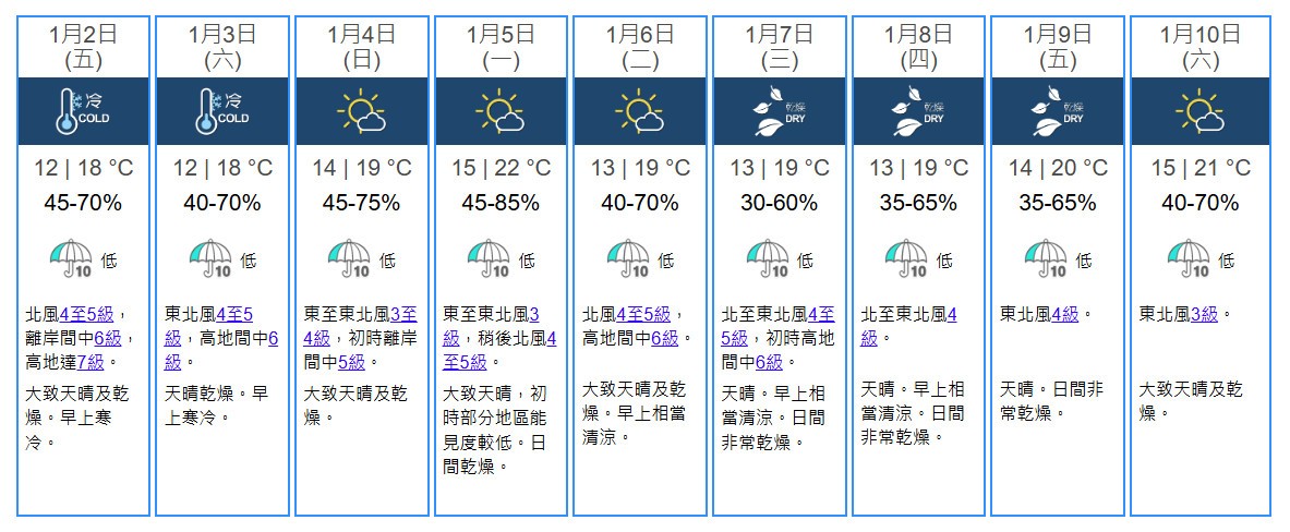 香港地區未來9天天氣預報。香港天文台截圖 香港地區今明天氣預測:今天(1月2日)大致天晴及乾燥。早上寒冷。日間最高氣溫約18℃。吹和緩至清勁偏北風,離岸及高地間中吹強風。明早(1月3日)仍然寒冷,日夜溫差較大。下週初持續天晴乾燥,但早上天氣清涼。(完) 【編輯:豐悅】