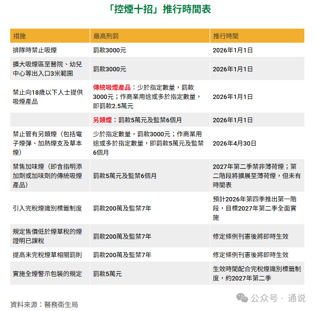 政府列明禁煙的指定場所(圖源:政府新聞處) 此外,排隊時也禁止吸煙,包括在排隊等候巴士、小巴、的士和電車等公共交通工具時、在等候這些交通工具的地點劃定範圍內、以及在排隊等候進入指定處所或在指定處所內時,只要隊伍中超過2人就違反了條例。 罰款也相應提升,2026年1月1日起,任何人在法定禁止吸煙區或公共交通工具內吸煙,執法人員都有權向他們發出定額罰款通知書,罰款金額將由1500元增加至3000元。 十招全數推出 事實上,這三項新規只是第一步。2025年4月25日,香港醫衞局便已“預告”將分階段推出“控煙十招”。除了以上三項新規外,還將走私私煙罰則,由現時買賣、管有,最高罰100萬元、入獄兩年,提升至罰200萬、監禁7年。