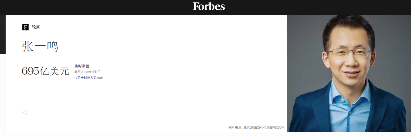 張一鳴首登中國首富 AI新貴入榜折射經濟轉型新趨勢分享到: