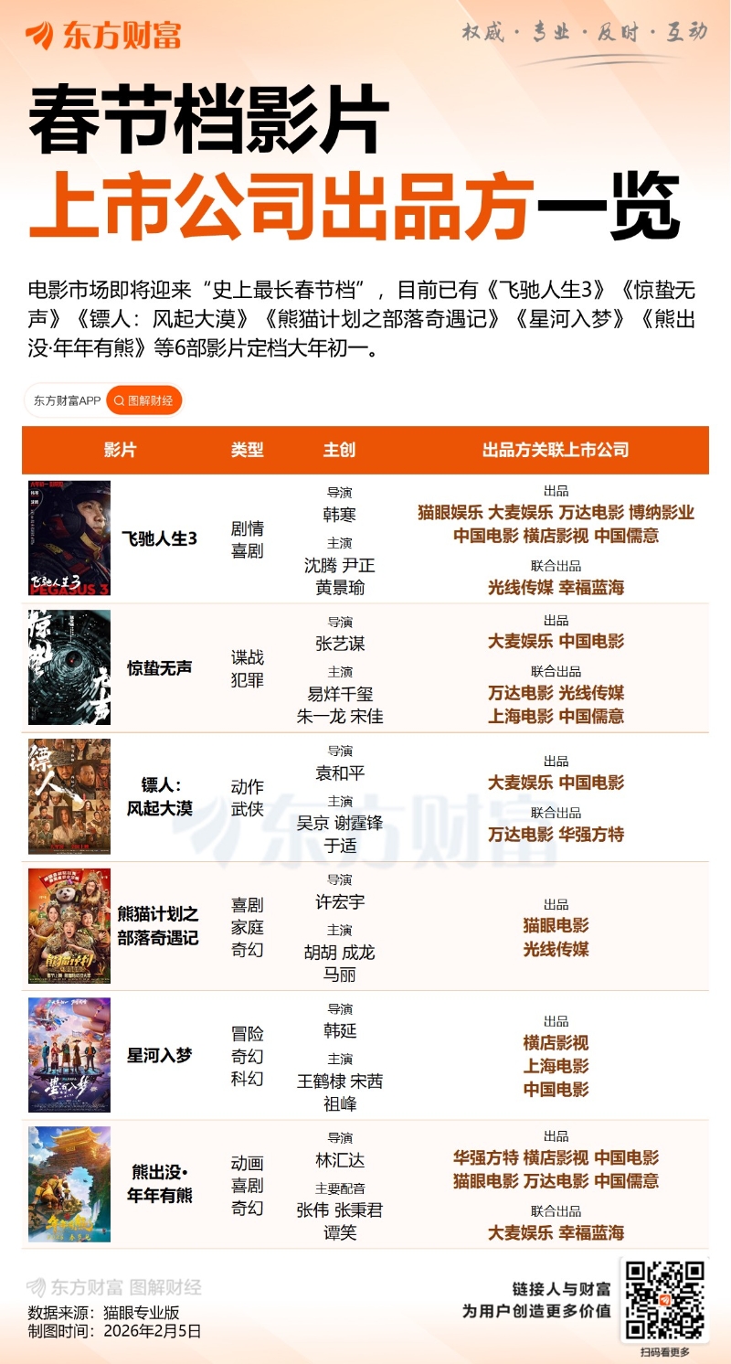 香港新聞網2月9日電 2026年中國春節檔帷幕即將拉開,大年初一(2月17日)將有6部重磅影片同日上映,涵蓋賽車、喜劇、國安、武俠等多元題材,集結沈騰、成龍、張藝謀等明星與導演。其中,《飛馳人生3》《熊貓計劃之部落奇遇記》等憑藉豪華陣容與優質內容領跑“想看”榜單。影視板塊聚焦春節檔表現,橫店影視、光線傳媒等出品方業績預增,融資餘額顯著攀升,AI技術賦能內容生產成新亮點。這場“科技+傳統”的春節文化盛宴,能否延續檔期輝煌?