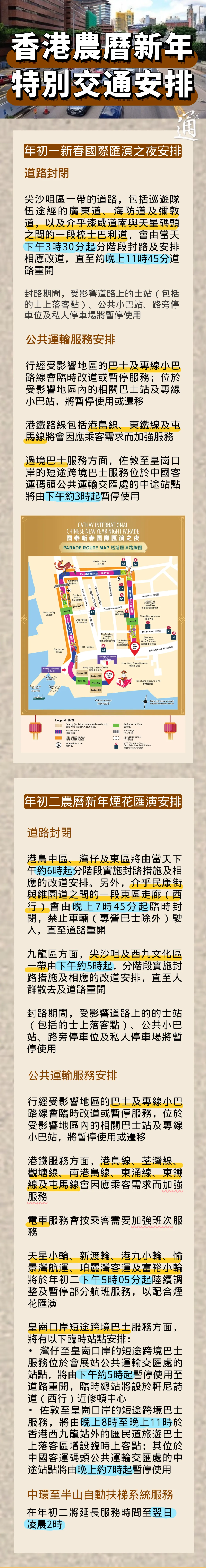 (香港新聞網製圖) 年初一尖沙咀區一帶道路,包括巡遊隊伍途經的廣東道、海防道及彌敦道,以及介乎漆鹹道南與天星碼頭之間的一段梳士巴利道,會由當天下午3時30分起分階段實施封路措施及相應的改道安排,直至晚上11時45分道路重開。 年初一港島中區、灣仔及東區將由當天下午約6時起分階段實施封路措施及相應的改道安排。尖沙咀及西九文化區一帶由下午約5時起,分階段實施封路措施及相應的改道安排,直至人群散去及道路重開。 兩日封路期間,受影響道路上的士站、公共小巴站、路旁停車位及私人停車場將暫停使用;行經受影響地區的巴士及專線小巴路線會臨時改道或暫停服務。港鐵路線會因乘客需求而加強服務。 天星小輪、新渡輪、港九小輪、愉景灣航運、珀麗灣客運及富裕小輪將於年初二下午5時零5分起陸續調整及暫停部分航班服務,以配合煙花匯演。(完) 【編輯:馬華】