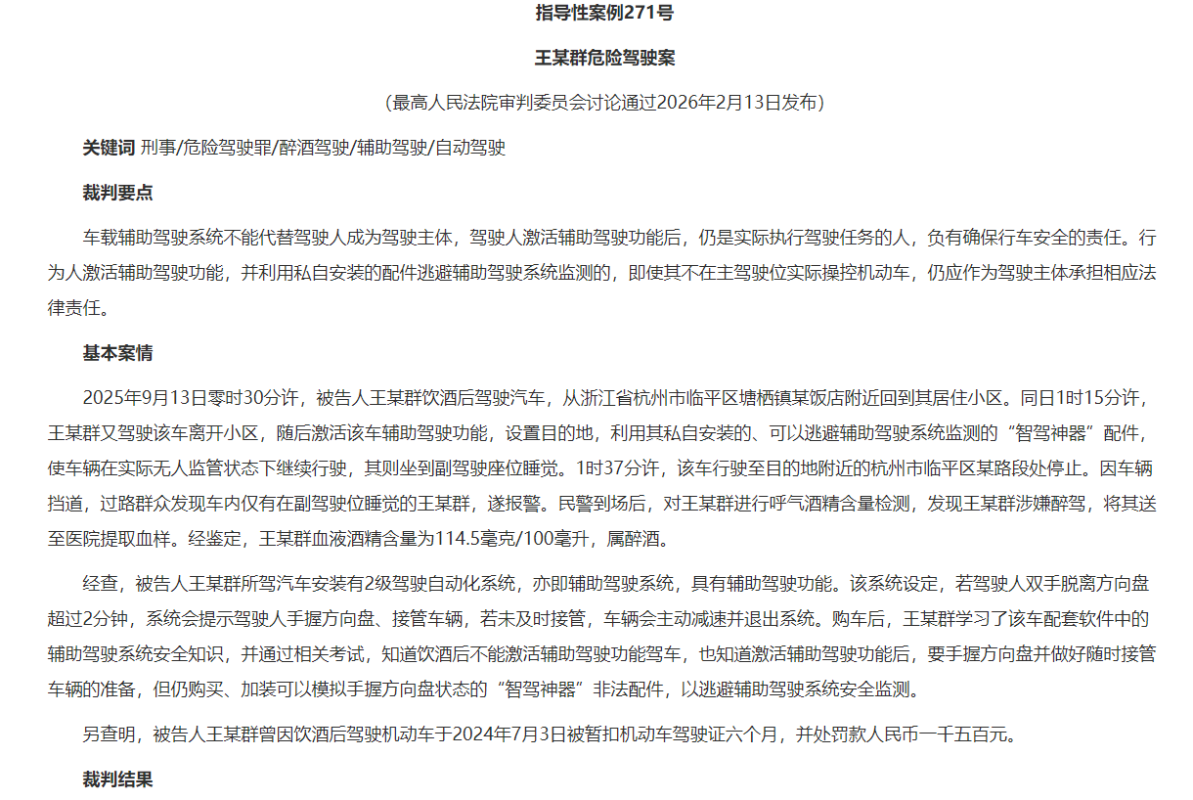 案例截圖 此次發布的典型案例包括“王某群危險駕駛案”。事發於去年9月13日凌晨,王某群在血液酒精含量達每100毫升114.5毫克(屬醉駕)的情況下,駕駛車輛離開小區後激活輔助駕駛功能,使用私自安裝的“智駕神器”逃避系統監測,隨後坐到副駕駛位睡覺。車輛自行行駛至杭州臨平區某路段停駛,因擋道被群眾發現報警。法院最終以危險駕駛罪判處其拘役一個月十五日,並處罰金4000元人民幣,判決已生效。 最高法強調,當前輔助駕駛技術雖日益普及,但部分駕駛人誤以為可“脫手脫眼”,甚至通過非法配件規避系統監管,嚴重威脅公共安全。裁判要點明確指出:只要行為人啟動車輛並激活輔助駕駛功能,即視為實際執行駕駛任務,必須全程保持對車輛的控制與警覺;即便未手握方向盤或身處副駕,仍構成法律意義上的“駕駛人”,需承擔相應刑責。 除輔助駕駛責任認定外,本批指導案例還細化了毒駕肇事定罪量刑規則、醉駕共犯成立範圍等爭議問題,統一全國裁判標準。數據顯示,2025年全國涉道路交通安全刑事案件數量整體下降,交通肇事案4.3萬餘件(同比下降超3%),危險駕駛案23萬餘件(同比下降近16%),但新技術帶來的法律適用難題日益凸顯。(完) 【編輯:彭玉婷】