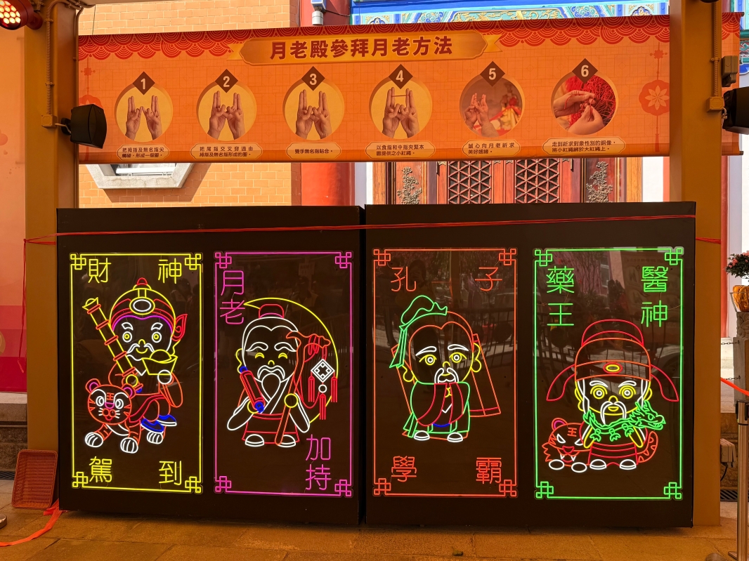 參拜區,大家按道教儀軌結成“手印”,將手中紅繩繫在金童玉女像與月老間的大紅繩上,祈求月老為自己牽上命中注定的那條線 。