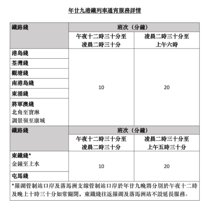 港鐵年廿九通宵服務安排(MTR Mobile截圖) 年廿九(16日)、年初一(17日)特別交通安排如下: 港鐵 港島線、荃灣線、觀塘線、將軍澳線(北角至寶琳段及調景嶺至康城段)、南港島線、東涌線、東鐵線(金鐘至上水段)、屯馬線,以及輕鐵線第505、507、610、614P、615P、706及751號會通宵提供服務。 除機場快線及迪士尼線外,港鐵路線將於下午3時起分階段加密班次,並在其他時段因應乘客需求而加強服務。港鐵巴士第506、K51及K54A號線將會延長服務時間。 屯馬線會於年初一晚上加密班次,方便市民觀賞花車巡遊匯演。迪士尼線亦會於年初一至年初七,加密早上時段的列車班次,方便市民及旅客前往主題樂園。 巴士 8條特別巴士路線(城巴第38S;九巴第N43、N64P、N243、N272;及過海巴士第N116、N600及N601號線)會於年初一(17日)凌晨提供特別巴士服務。 渡輪 天星小輪大年初一(17日)上午6:30至晚上11:30免費乘搭。(完) 【編輯:王少喆】