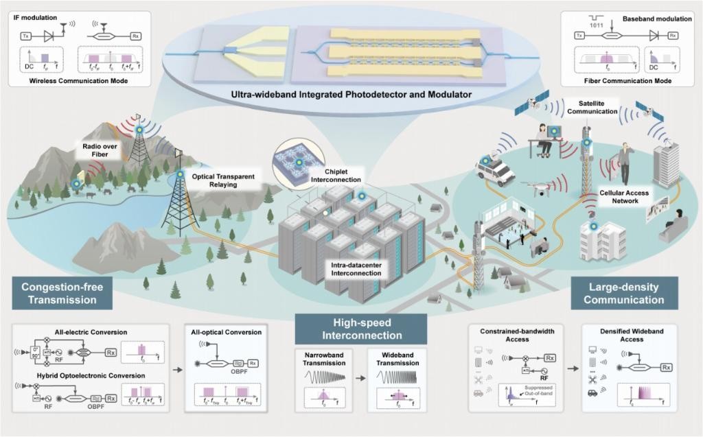 圖為“光纖—無線一體化融合通信系統”概念圖。圖源:新華 “新系統破解‘帶寬鴻溝’,數據傳輸速率刷新目前已知的新紀錄。”論文通訊作者、北京大學電子學院副院長王興軍說,這一系統可支持光纖通信和無線通信雙模式傳輸,顯著提升了抗干擾能力。團隊還模擬了6G大規模用戶接入場景,實現86個信道的多路實時8K視頻接入演示,傳輸帶寬較目前5G標準提升10倍以上。 王興軍表示,該成果就像是通信領域的“全能戰士”,除實現兼容且超大容量通信外,在能耗、成本、規模化等方面也有卓越的表現。未來可在6G基站、無線數據中心等場景中廣泛應用。該成果成功突破三項世界紀錄,包括250GHz(千兆赫茲)以上超大帶寬的光電/電光轉換器件、薄膜鈮酸鋰調製器和磷化銦探測器帶寬。(完) 【編輯:李濼】