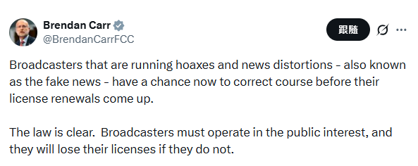 美國聯邦通信委員會(FCC)主席布倫丹·卡爾的社交平台X截圖 然而,美國總統特朗普則公開力挺卡爾。3月15日晚,特朗普在其自創社交平台“真實社交(Truth Social)”發文,表示“非常高興看到這一威脅”。隨後,特朗普還補充用 “犯罪”“不愛國” 等字眼抨擊一些美國媒體機構,並揚言考慮以“叛國罪”起訴它們。 據了解,截至目前,被特朗普及其官員批評的媒體和記者包括CNN、《紐約時報》、《華爾街日報》、美國廣播公司(ABC)等。雖然CNN等媒體均不受 FCC 監管,但地方電視台不同,比如ABC和CBS(哥倫比亞廣播公司),它們使用公共電波廣播,執照有效期為8年。 《紐約時報》指出,特朗普對多家美國新聞機構的貶低,正值他竭力將他的中東軍事行動描繪成“巨大成功”之際——但事實並非如此;而且民意調查顯示,美國人對戰爭普遍存在疑慮。因此,特朗普政府對新聞機構施壓,目的是迫使媒體減少對戰爭行動的批評性報道,或至少引導公眾質疑不符合政府立場的報道。 然而,據CNN報道,美國各大主流媒體並未因政府施壓而退縮。CNN 董事長兼首席執行官馬克・湯普森近期在一份聲明中說:“政客們顯然有動機宣稱,對其決策提出質疑的新聞報道是虛假的。在 CNN,我們唯一的宗旨是向美國及全球受眾講述真相,再多的政治威脅或辱罵都無法改變這一點。” CNN還進一步指出,特朗普政府這場 “攻擊信使” 的策略毫無掩飾可言,但也可能暴露了其某種焦慮:要麼是對這場戰爭異常低迷的民眾支持率感到不安,要麼是對戰爭實際進展心存疑慮。