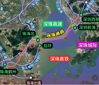 深珠通道又稱“伶仃洋通道”,是粵港澳大灣區規劃的首條跨海公鐵兩用通道,位於深中通道與港珠澳大橋之間,距深中通道約12公里,距港珠澳大橋約20公里,三條跨海通道呈“三”字,深珠通道是中間一橫。項目東起深圳前海,西至珠海高新區,建成後兩地可實現30分鐘直達,加速構建大灣區“半小時生活圈”。