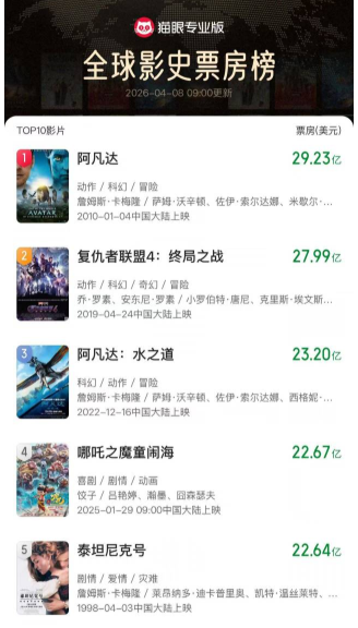 《哪吒2》登頂全球票房第四 中國動畫IP迎商業化里程碑香港新聞網4月10日電(記者 錢林霞)據貓眼專業版最新數據顯示,截至4月9日,國產動畫電影《哪吒之魔童鬧海2》(簡稱《哪吒2》)全球票房攀升至22.67億美元,正式超越經典影片《泰坦尼克號》的22.64億美元,躋身全球影史票房榜第4位。除了票房這一核心收入來源,《哪吒2》IP已延伸至全產業鏈。《哪吒2》周邊熱銷的背後,不僅是電影熱度與IP價值的延續,更折射出優質內容和成熟衍生品市場相互賦能的良性循環。 商業化破局:從票房神話到全產業鏈布局 《哪吒2》這部由餃子編劇并執導的動畫作品,自2025年1月29日上映以來,已打破113項紀錄,斬獲308項里程碑式成績,不僅登頂全球動畫電影票房榜、成為亞洲首部票房過百億影片,更創造了全球單一電影市場最高票房紀錄。央視新聞評價稱,《哪吒2》展示了中國電影的工業實力與文化魅力,打破了國外IP壟斷,實現了從中國文化積澱到中國IP樹立的升級。