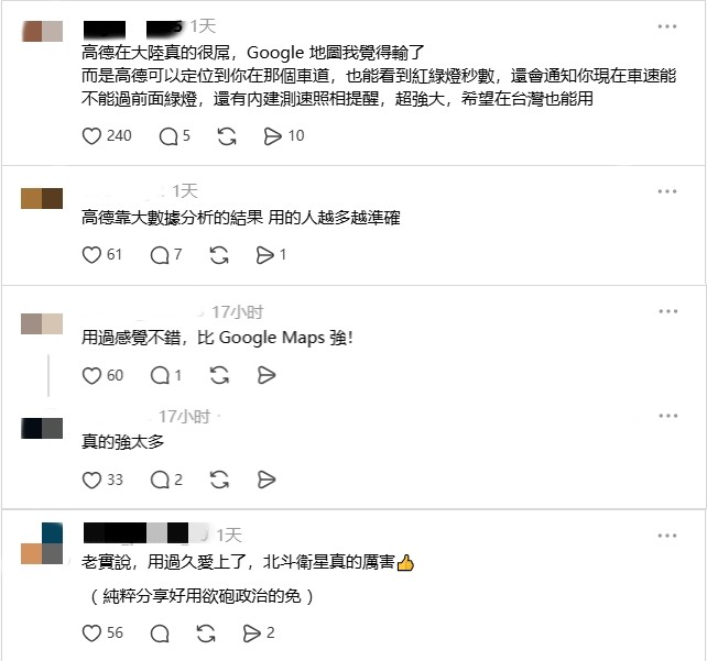 其他台灣網友也紛紛直言,“看來用的人越來越多了,高德地圖比Google地圖好用太多,連幾車道都有劃出來。”“高德的細節真的處理得很棒,例如車道的匯出匯入、突然的爬坡道都標示得很清楚。”“老實說,用過就愛上了,北斗衛星真的厲害。”