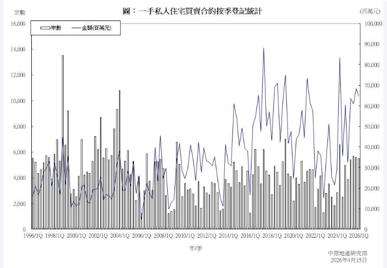 2026年第1季一手私人住宅買賣合約登記統計分析 (圖源:中原地產) 中原地產研究部高級聯席董事楊明儀指出,2026年首季一手私人住宅買賣合約登記錄5,506宗,總值647.50億元,較2025年第四季5,577宗及684.30億元,按季分別下跌1.3%及5.4%。雖然宗數及金額輕微回落,但仍連續四季逾5,000宗水平,反映一手市場交易持續活躍。 內地買家是主力 好樓盤受追捧 據香港土地註册處數據顯示,第一季度香港整體物業註册量達23292宗,同比大幅上升約46.4%,創下13年同期新高。住宅市場表現尤為突出,根據美聯報告數據,2026年首季香港一手私宅成交量錄得6291宗,同比急升43.8%,創自2013年《一手住宅物業銷售條例》實施以來的同期新高;二手住宅成交量預計錄得約1.46萬宗,同比亦大漲約41%,創近5年同期高位。 據中原地產數據,新鴻基為首季新盤銷售金額最高,2026年首季主要樓盤登記銷售金額最高的發展商為新鴻基,錄1,708宗及148.72億元,其他主要發展商包括:恆基錄69.69億元 (435宗)、會德豐錄47.12億元 (516宗)、信和錄45.12億元(607宗)。 從買家來看,美聯物業分析師岑頌謙在接受21世紀經濟報道採訪時表示,今年第一季度內地買家在港置業宗數近3900宗,同比上升逾50%;成交金額更是突破400億港元,同比大幅上升逾90%。值得注意的是,內地買家入市熱情已呈現持續性而非一次性特征——其月度成交量已連續13個月維持在超千宗水平,創有紀錄以來最長連續期,反映內地買家參與香港樓市已趨於常態化。 上半年香港住宅市場交投量將持續上升 楊明儀預料今年第二季宗數可維持5,500宗以上。他說,今年農曆新年延遲至2月,買家提早於1月新春前入市,發展商乘時推售大型新盤,銷情理想推高首季宗數創2004年首季10,776宗後二十二年來最高首季數字,金額更創有記錄以來第一季歷史新高。2月底中東衝突升級,全球股市波動,但無阻用家及投資者入市。隨著中東戰事未有進一步升級,股票市場回穩,近日一個月拆息反覆在2厘水平徘徊,增加買家入市信心,多個新盤復活節後推售,第二季宗數可維持5,500宗以上,料今年上半年一手登記宗數逾11,000宗。