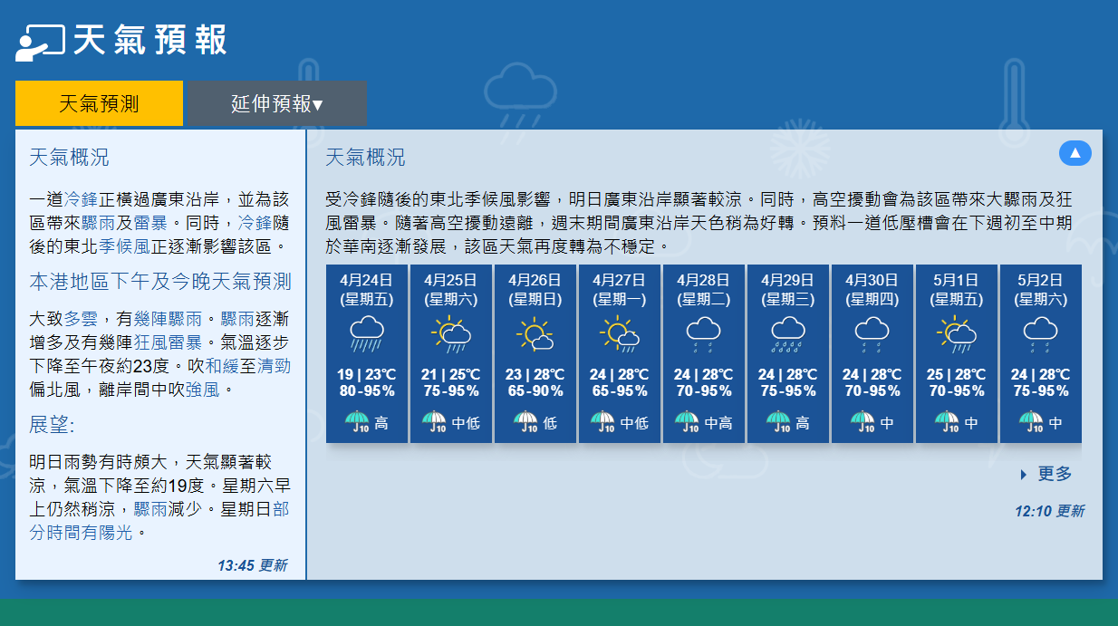 香港地區大致多雲,有幾陣驟雨。驟雨逐漸增多及有幾陣狂風雷暴。氣溫逐步下降至午夜約23度。吹和緩至清勁偏北風,離岸間中吹強風。 23日雨勢有時頗大,天氣顯著較涼,氣溫下降至約19度。星期六早上仍然稍涼,驟雨減少。星期日部分時間有陽光。(完) 【編輯:陳卓儀】