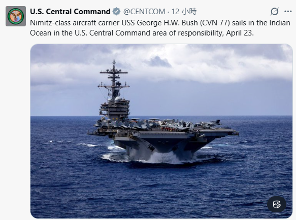 美軍中央司令部社交媒體截圖 據美國軍方介紹,中央司令部轄區覆蓋波斯灣、紅海、阿曼灣以及位於印度洋西北部的阿拉伯海。 “布什”號航母打擊群於3月31日從美國東海岸的弗吉尼亞州諾福克海軍基地出發,繞行非洲好望角,前往中東。據美媒報道,“布什”號航母打擊群包含數艘驅逐艦,總計有5000多名官兵。 目前,美軍“福特”號和“林肯”號兩個航母打擊群分別部署在紅海和阿拉伯海北部。美媒報道稱,“布什”號很可能將接替“福特”號。交接期間,預計美軍將在中東地區形成“布什”號、“福特”號、“林肯”號三航母部署態勢。 以色列國防部長卡茨23日晚在一段視頻聲明中說:“以色列已做好再次對伊朗開戰的準備。以軍已做好防禦和進攻的準備,目標已經確定。”卡茨稱,以色列正在等待“美國開綠燈”,以“徹底消滅伊朗政權”,以軍已準備好對伊朗“最脆弱的地方”進行“毀滅性打擊”。 以色列第12頻道電視台報道說,卡茨當天在以軍總部主持一次特別形勢評估會議,以軍高級將領和國防機構官員參加了會議。卡茨在會後稱,以軍已做好充分準備,隨時可重啟對伊朗軍事行動,作戰方案包括打擊伊朗最高領導層的“接班人”、伊朗重點能源和電力設施、經濟基礎設施等,將使伊朗倒退回“黑暗的石器時代”。 據伊朗方面23日消息,鑒於外交解決受挫及對美方談判誠意的“徹底不信任”,伊朗方面已根據“對等回應”和“進攻性威懾”原則,對美方及其盟友“可能的”軍事行動制定反擊方案。 據悉,該方案根據不同情形設定多種回應方案。 此外,伊朗或將針對該地區外有關美國利益的目標發動突襲行動。(完) 【編輯:林曉惠】