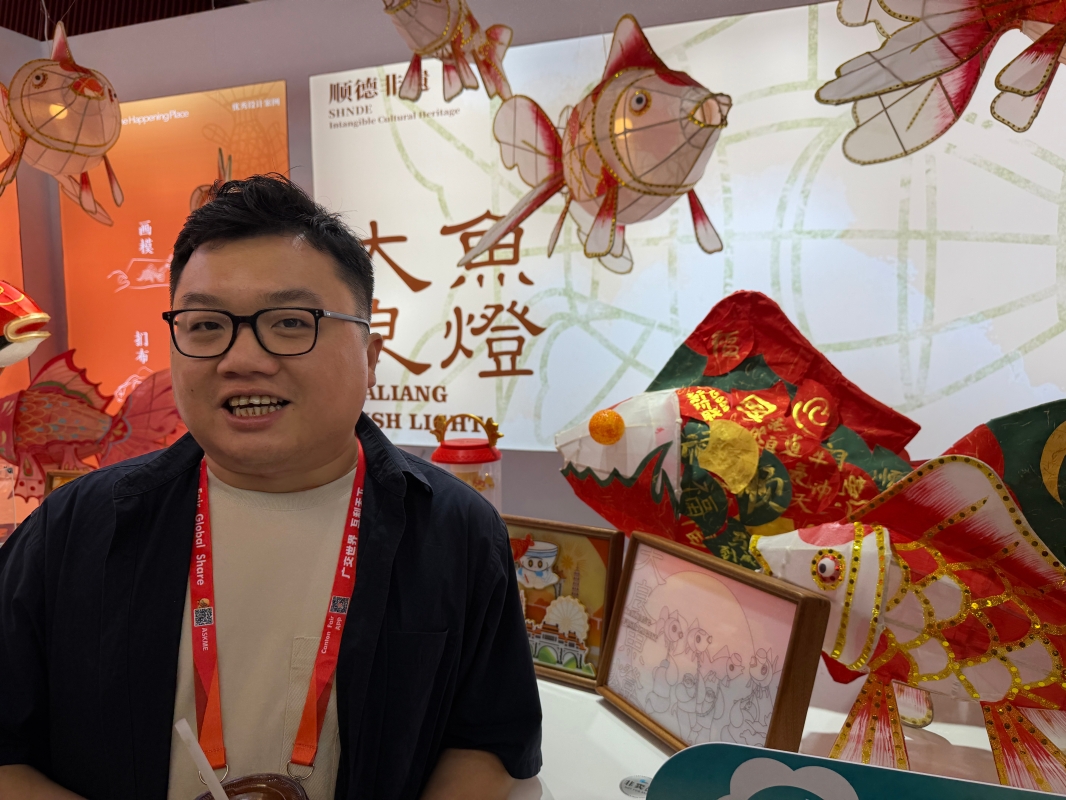 佛山市順德區政協委員、大良魚燈協會會長劉鏗帶著魚燈來廣交會(記者 馮秋榆 攝) 廣交會外商:“可以給我講講中國魚燈的故事嗎?” 在第139屆廣交會二期B區,記者在展品中見到了順德非物質文化遺產——“大良魚燈”和“雙皮奶”,充滿中國傳統韻味的展台吸引眾多外商駐足。“我理解‘非遺’的概念,可以給我講講魚燈的故事嗎?”一位來自巴西的外商問道。佛山市順德區政協委員、大良魚燈協會會長劉鏗向外商講解大良魚燈文化:“順德人從北宋末年就開始用桑基魚塘養魚,塘基種桑-桑葉餵蠶-蠶糞養魚,魚讓順德人生活富足,也更喜歡吃魚,做魚就更厲害,所以順德人愛魚燈,魚在中國文化里也是富足的象徵。” 劉鏗接受香港新聞網記者專訪(記者 馮秋榆 攝) 劉鏗對香港中通社記者談到參加廣交會、接觸外商的感受說:“以往外國人對中國的了解就是圖騰化的龍和醒獅,然而隨著中國文化在全球的傳播,外國人對中國的興趣和好奇日益增多,很多外商都很喜歡中國文化,了解得也越來越接近本土的生活。類似於非遺魚燈這種文化產品可以讓中國文化直觀展現,對於中國文化的認同,更是與外商進行更高維度的交流、合作的契機。” 年齡接近90後的劉鏗對於大良魚燈的開發和文化保育已開展了11年,他認為,當代非遺不是通過一兩次美學創新就可以延續生命,“文旅+工業化商品”是跨越非遺賽道的一步棋。2026年,代表順德大良形象的“皮皮”和“鯉鯉”文創紀念品面世,雙皮奶與大良魚燈成為新一代大良文化的代表。 “廣交會是重要的貿易場所,但也是一個很好的文化表達的載體,來到廣交會的商家都非常優秀,相信在中外文化的碰撞中可以擦出更棒的火花,這次失算了,我們應該把粵菜大厨也帶過來:美食、魚燈、魚,把好吃的、好看的分享給大家,會讓外商眼中的中國形象更有趣。”劉鏗說。 DIY紙插“河北梆子” 讓“文化出海”可觸摸 在第139屆廣交會,香港新聞網記者還邂逅了“國家文化出口重點企業”河北潤石文創,作為連續十幾年到會的“老廣交”,潤石多年來通過廣交會累積了數百家穩定客戶,並由此走向全球。工作人員介紹,其2025年廣交會新品《繁花》禮盒中的絲巾圖案靈感來自千年古寺毗盧寺中精美的古代彩色壁畫,上市僅兩個月訂單成交額即達30萬美元,已出口到美國、德國、俄羅斯、瑞典等國。本次廣交會展出的《河北梆子》DIY紙插取材非遺文化河北梆子經典曲目中的人物形象,獲廣交會CF獎銀獎。