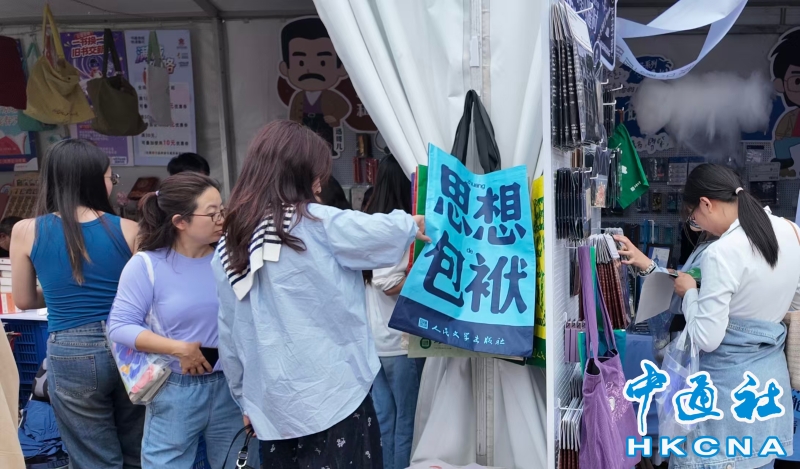 •     2026年4月25日,2026年春季北京書市期間,朝陽公園展區內人民文學出版社旗下的“朝花夕拾·文創咖啡供銷社”展位前,讀者們正在選購文創產品。 香港中通社圖片