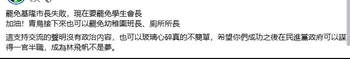 (截圖自“政客爽”) 陸生團早前參訪台中洲際棒球場,復旦大學同學宋思瑤受訪表示,“代表師生訪問團祝賀中國台北隊,希望大陸和台灣同胞像中信兄弟英文隊名中的‘Brothers’一樣,一起為祖國棒球領域更上一層樓。” “中國台北”一詞似乎刺痛綠營玻璃心,連日來引發民進黨側翼攻擊,認定陸生團有意“統戰”、“矮化”。 台大社科院接待陸生團後,社科院學生會在社交平台發文表示,“我們一同觀看台大形象影片,一同走訪台大標誌性地點” ,走過台大的新與舊,相信可以帶給訪團關於這美麗校園的雋永回憶。 社科院學生會又說,能夠與中國大陸頂尖大學的學生交流,對社科院、對台大是多多益善。 未料亦引來部分社科院學生跳出來,對社科院學生會長發動罷免。 “罷免基隆市長失敗,現在要罷免學生會長。”針對部分社科院學生舉動,“政客爽”近日在社交平台臉書發文諷刺,“加油!青鳥(指民進黨的支持者)接下來也可以罷免幼稚園班長、廁所所長。”