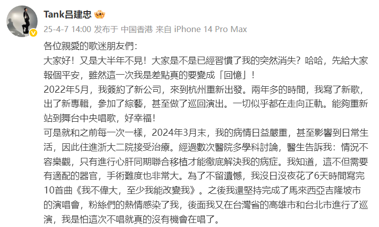 TANK(呂建忠)的微博截圖 他透露,他在2022年5月簽約了新公司,來到杭州重新出發。但在2024年3月末,病情加重,甚至影響到日常生活,因此住進浙大二院接受治療,醫生表示他只有進行心肝同期聯合移植才能徹底解決病症。 他知道很難等到適配的器官,而且手術難度也大,為不留遺憾,他選擇在剩下的時間裡繼續完成自己的音樂夢想。但他的病情繼續加重,心臟衰竭、肝臟惡化,9月已經無法站立,11月初,他甚至吃不下任何東西,心臟和肝臟功能指標都極度異常,凝血功能也出現問題。 就在TANK萬念俱灰之際,11月21日,一位腦死亡大愛者決定無私地捐獻器官,浙大二院迅速集合了各個專業團隊,根據之前制定的手術方案進行細緻的術前討論,并在各方配合下完成了心肝同期聯合移植手術。手術整整持續了12個小時,把他從死亡線上拉了回來。 TANK在文中對大陸政府表示感謝:“感謝祖國,感謝杭州,這是最堅強的後盾,支撐我度過人生最大的難關。”也向浙大二院的醫護人員、經紀公司和大愛捐贈者表示了感謝。 對於自己罹患先天心臟病,多位家人也因此離世,TANK表示:“曾經我無數次痛恨,為什麼命運對我如此的不公平。因為心臟病,我在最好的年華離開了無比熱愛的音樂舞台。因為心臟病,至親至愛的姐姐離開了我。”如今的他坦言比任何時候都釋懷,也比任何時候都懂得“活著”的意義。 該消息在網絡引發兩岸網友的關注,大家紛紛為“重生”的TANK獻上祝福。