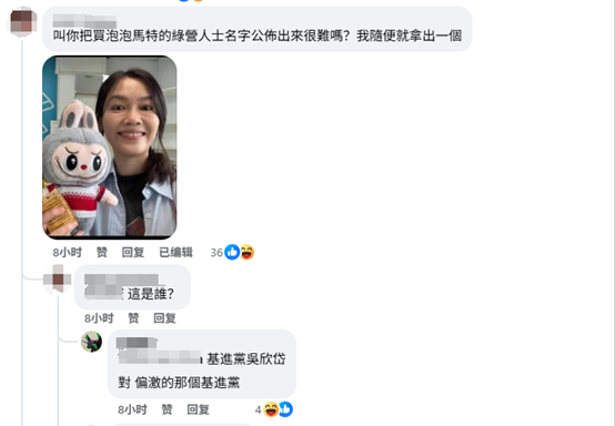 網友評論 還有網友翻出基進黨人士吳欣岱手舉拉布布公仔自拍的照片,表示綠營中也不乏喜歡和購買泡泡瑪特的人,打臉攻擊徐巧芯的人。 在意識形態操作下,部分綠營人士“逢中必反”,連LABUBU玩偶也容不下,不僅引人哄笑,也會將自己自絕於主流大勢之外! 【編輯:王瑤】