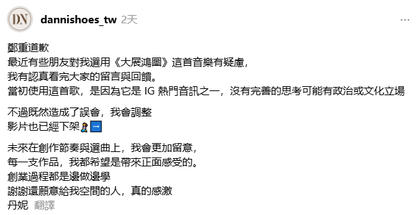 香港新聞網6月27日電(編輯 丘志彬)來自大陸的“洗腦”神曲《大展鴻圖》最近在台灣爆火,許多人因為其魔性旋律而愛上,但也招致島內某些人不滿。最近,繼台中市政府官員之後,又一位台灣業者因為這首歌慘遭“出征”。 日前,台灣業者“丹妮鞋屋”在社交平台發佈其最新的宣傳片,片中使用了當下在年輕人中最流行的歌曲《大展鴻圖》作為背景音樂。業者本意是利用網絡熱點,擴大宣傳,結果遭到一部分人揚言抵制。這些人認為這首歌是傳播大陸文化,痛批“丹妮鞋屋”自許台灣製鞋人、台灣在地鞋廠,卻去用大陸的音樂和舞蹈來做行銷。 該鬧劇最終以“丹妮鞋屋”删除影片和認錯收場。6月25日,“丹妮鞋屋”發出道歉聲明,表示當初選用《大展鴻圖》,是因為它是IG熱門音訊,沒有完善的思考可能有政治或文化立場,“既然造成了誤會,我會調整。影片也已經下架。未來在創作節奏與選曲上,我會更加留意,每一支作品,我都希望是帶來正面感受的。”